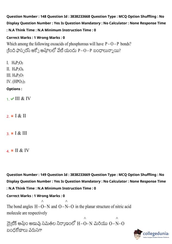 In the planar structure of the nitric acid molecule (\(HNO_3\)), the bond angle between \(H-O-N\) is approximately 102°, and the bond angle between \(O-N-O\) is around 130°. These angles are influenced by the electron repulsion around the nitrogen atom and the resonance structure of the molecule. Quick Tip: The bond angles in the nitric acid molecule are affected by the resonance structure and the repulsion between electron pairs.