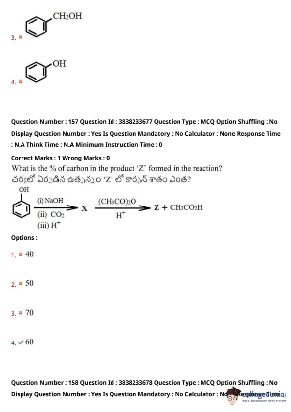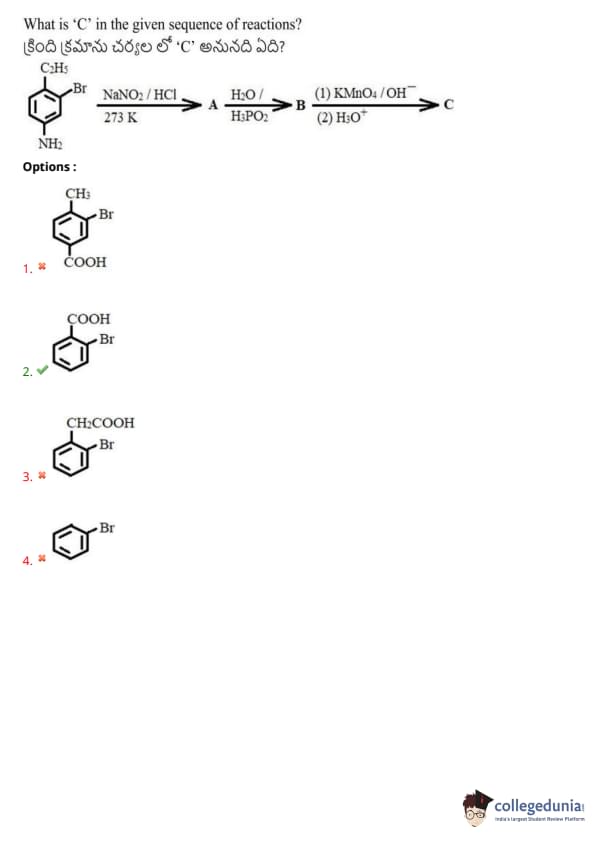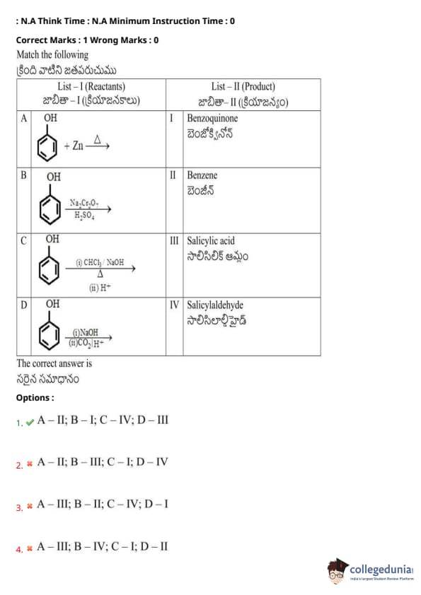 - D - III (Salicylic acid from phenol with NaOH and CO\(_2\)) Quick Tip: When dealing with aromatic compounds, pay attention to the reagents and their oxidation or reduction properties to predict the product.