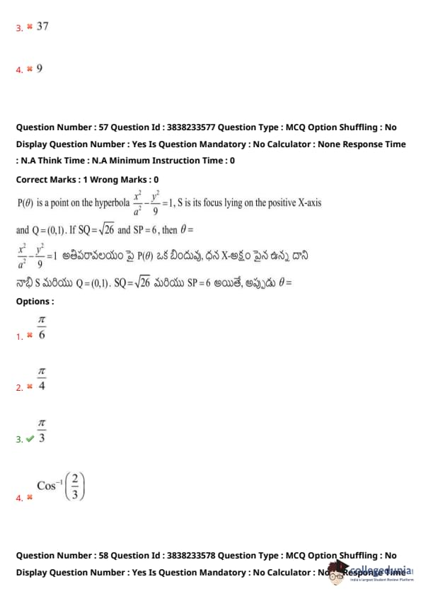 P(\( \theta \)) is a point on the hyperbola \( \frac{x^2}{a^2} - \frac{y^2}{9} = 1 \), S is its focus lying on the positive X-axis and Q = (0,1). If SQ = \( \sqrt{26} \) and SP = 6, then \( \theta \) is: