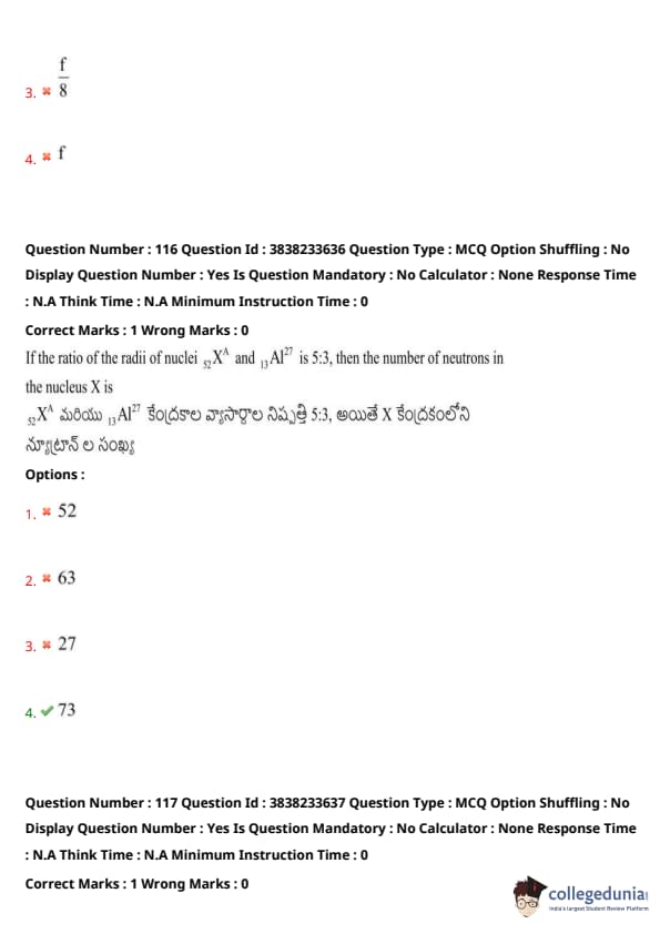 If the ratio of the radii of nuclei \( \mathbf{^{52}X_A} \) and \( \mathbf{^{13}Al^{27}} \) is 5:3, then the number of neutrons in the nucleus \( X \) is: