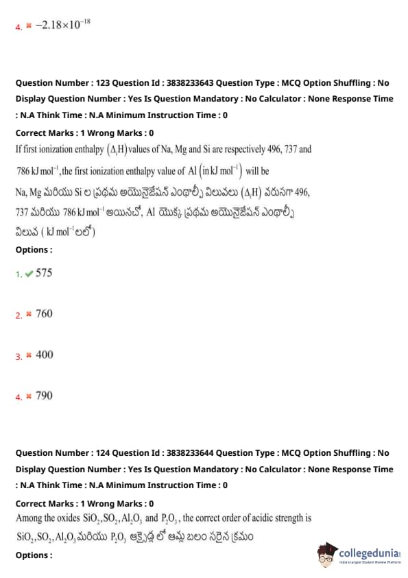 If first ionization enthalpy (\(\Delta H\)) values of Na, Mg and Si are respectively 496, 737, and 786 kJ/mol, the first ionization enthalpy value of Al (in kJ/mol) will be: