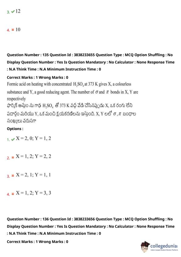 Formic acid on heating with concentrated H\(_2\)SO\(_4\) at 373 K gives X, a colourless substance and Y, a good reducing agent. The number of \(\sigma\) and \(\pi\) bonds in X, Y are respectively: