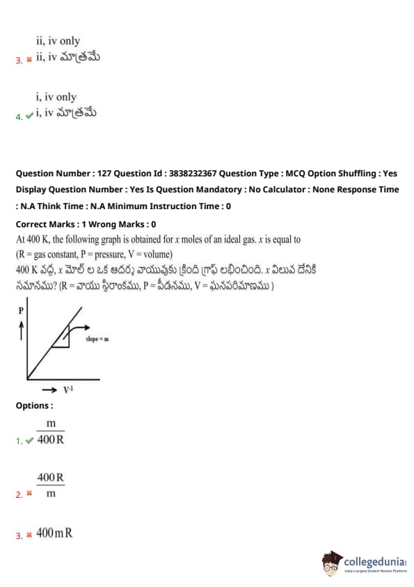 At 400 K, the following graph is obtained for \( x \) moles of an ideal gas. \( x \) is equal to (R = gas constant, P = pressure, V = volume)