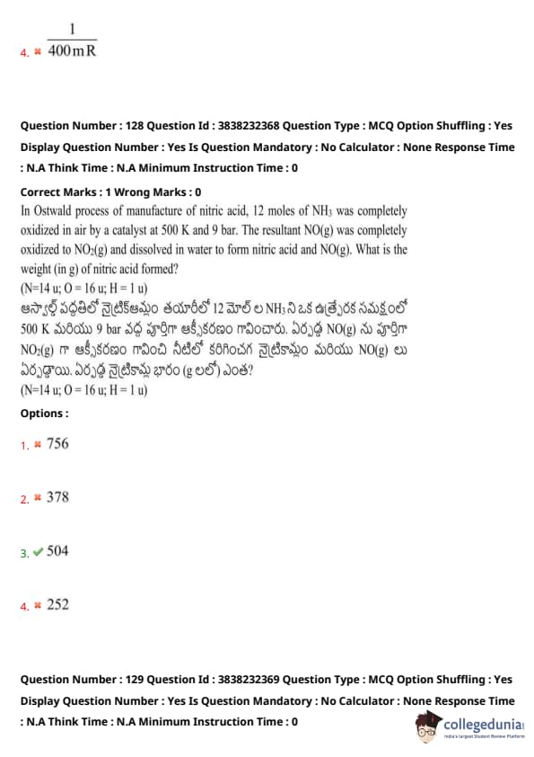 In Ostwald process of manufacture of nitric acid, 12 moles of NH3 was completely oxidized in air by a catalyst at 500 K and 9 bar. The resultant NO(g) was completely oxidized to NO2(g) and dissolved in water to form nitric acid and NO(g). What is the weight (in g) of nitric acid formed?