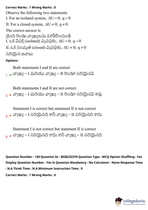 II. For a closed system, \( \Delta U = 0 \); \( q \neq 0 \)