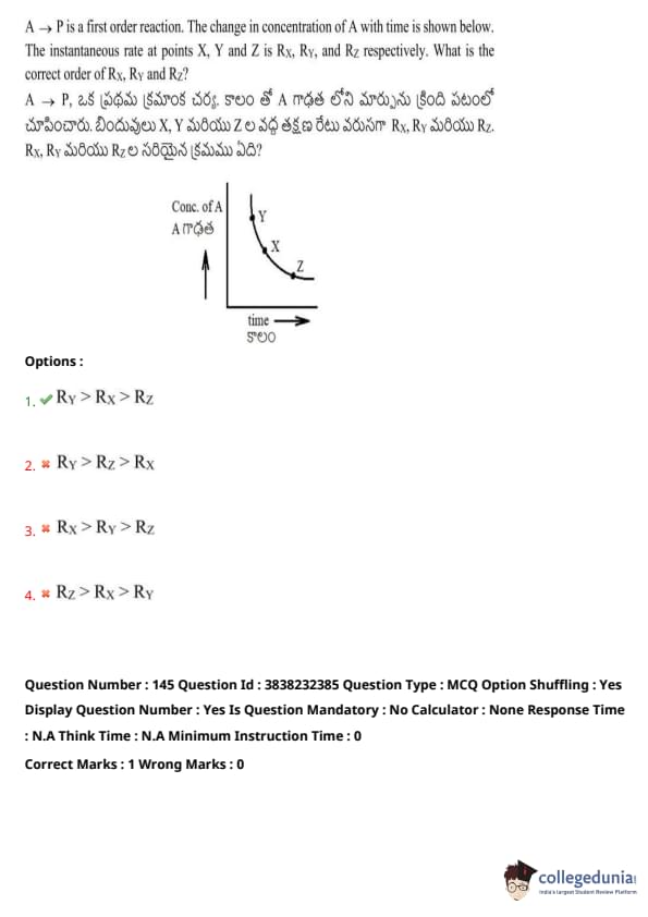 A \(\rightarrow\) P is a first-order reaction. The change in concentration of A with time is shown below. The instantaneous rate at points X, Y and Z is \( R_X \), \( R_Y \), and \( R_Z \), respectively. What is the correct order of \( R_X \), \( R_Y \), and \( R_Z \)?