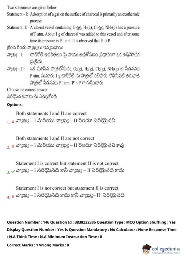 Statement II: A closed vessel containing \( O_2(g) \), \( H_2(g) \), \( Cl_2(g) \), \( NH_3(g) \) has a pressure of 9 atm. About 1 g of charcoal was added to this vessel and after some time its pressure is \( P' \) atm. It is observed that \( P' > P \).