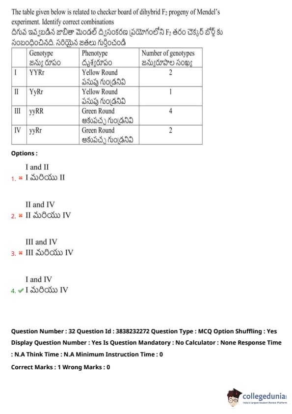 The table given below is related to the checkerboard of dihybrid F\(_2\) progeny of Mendel’s experiment. Identify the correct combinations: