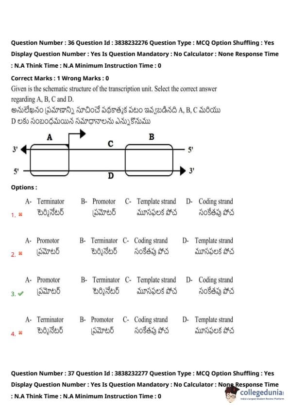 Given is the schematic structure of the transcription unit. Select the correct answer regarding A, B, C, and D: