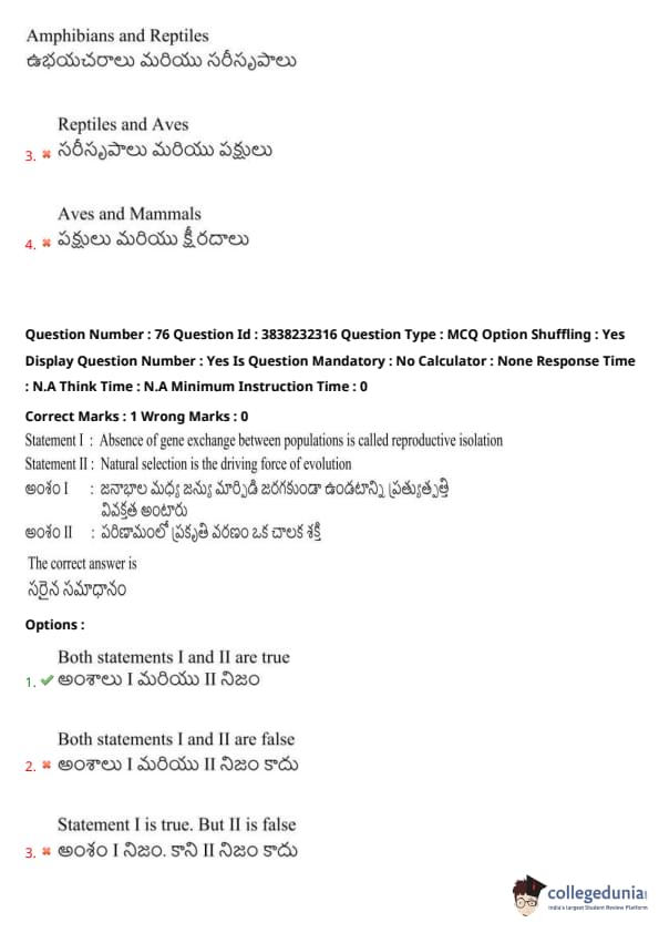 Statement I: Absence of gene exchange between populations is called reproductive isolation.
