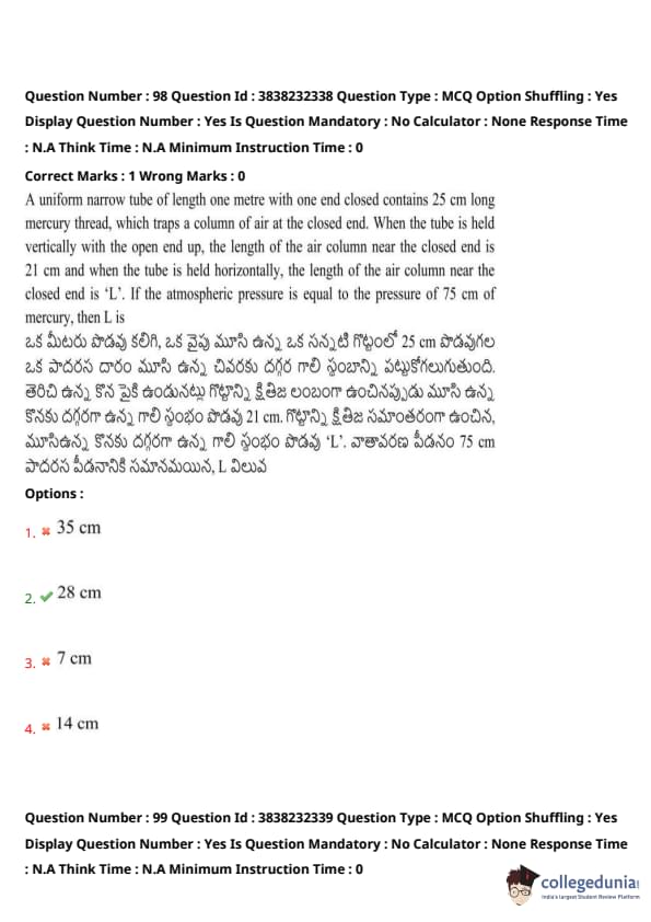 A uniform narrow tube of length one metre with one end closed contains 25 cm long mercury thread, which traps a column of air at the closed end. When the tube is held vertically with the open end up, the length of the air column near the closed end is 21 cm and when the tube is held horizontally, the length of the air column near the closed end is ‘L’. If the atmospheric pressure is equal to the pressure of 75 cm of mercury, then \( L \) is: