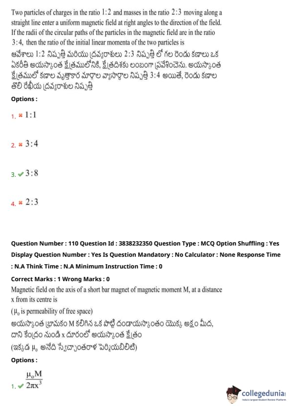 Two particles of charges in the ratio \( 1:2 \) and masses in the ratio \( 2:3 \) moving along a straight line enter a uniform magnetic field at right angles to the direction of the field. If the radii of the circular paths of the particles in the magnetic field are in the ratio \( 3:4 \), then the ratio of the initial linear momenta of the two particles is:
