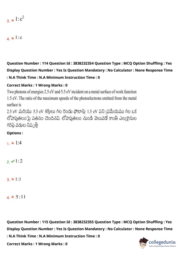 Two photons of energies 2.5 eV and 5.5 eV incident on a metal surface of work function 1.5 eV. The ratio of the maximum speeds of the photoelectrons emitted from the metal surface is: