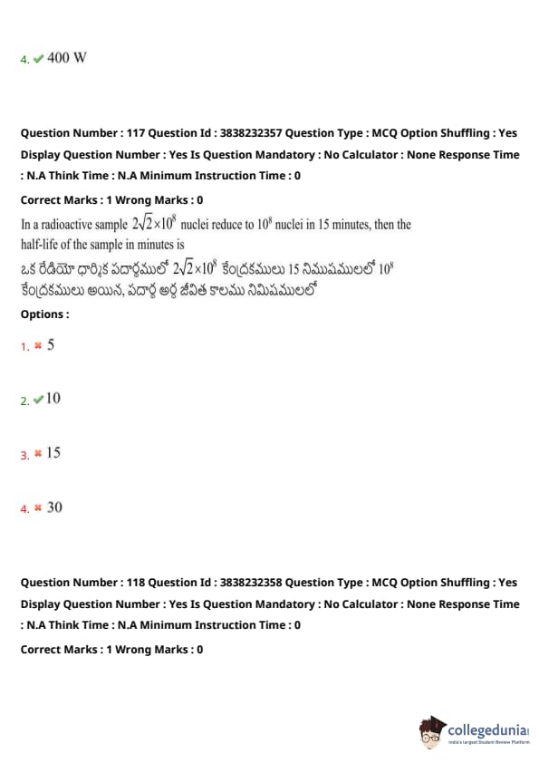 In a radioactive sample \( 2 \times 10^8 \) nuclei reduce to \( 10^8 \) nuclei in 15 minutes, then the half-life of the sample in minutes is: