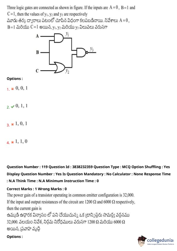 Three logic gates are connected as shown in the figure. If the inputs are \( A = 0 \), \( B = 1 \), and \( C = 1 \), then the values of \( y_1 \), \( y_2 \), and \( y_3 \) are respectively: