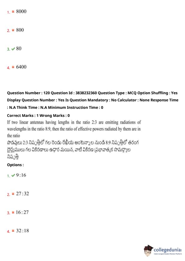 If two linear antennas having lengths in the ratio 2:3 are emitting radiations of wavelengths in the ratio 8:9, then the ratio of effective powers radiated by them are in the ratio: