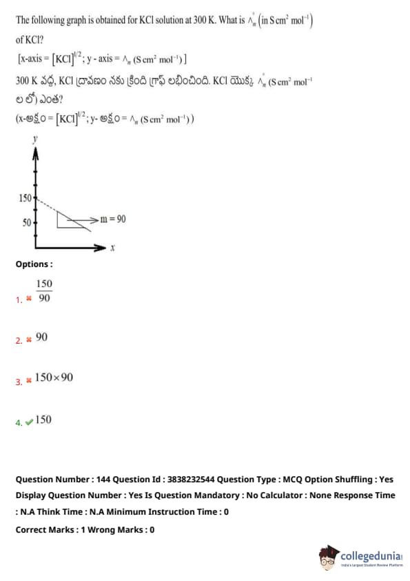 The following graph is obtained for KCl solution at 300 K. What is \( \Lambda_m^0 \) (in S cm² mol\(^{-1}\)) of KCl?