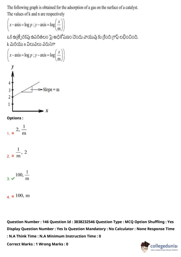 The following graph is obtained for the adsorption of a gas on the surface of a catalyst. The values of k and n are respectively