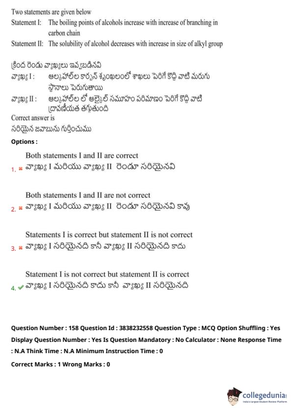 Statement I: The boiling points of alcohols increase with increase of branching in carbon chain.