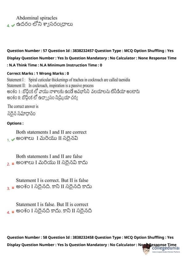 Statement I: Spiral cuticular thickenings of trachea in cockroach are called taenidia.