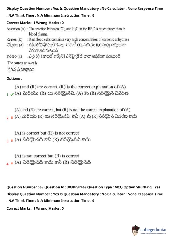 Assertion(A) :The reaction between \( CO_2 \) and \( H_2O \) in the RBC is much faster than in blood plasma.