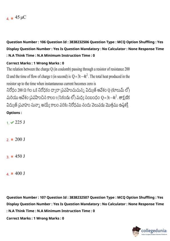 The relation between the charge \( Q \) (in coulombs) passing through a resistor of resistance 200 \(\Omega\) and the time of flow of charge \( t \) (in seconds) is \( Q = 3t - 4t^2 \). The total heat produced in the resistor up to the time when instantaneous current becomes zero is: