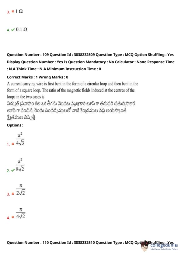 A current carrying wire is first bent in the form of a circular loop and then bent in the form of a square loop. The ratio of the magnetic fields induced at the centres of the loops in the two cases is: