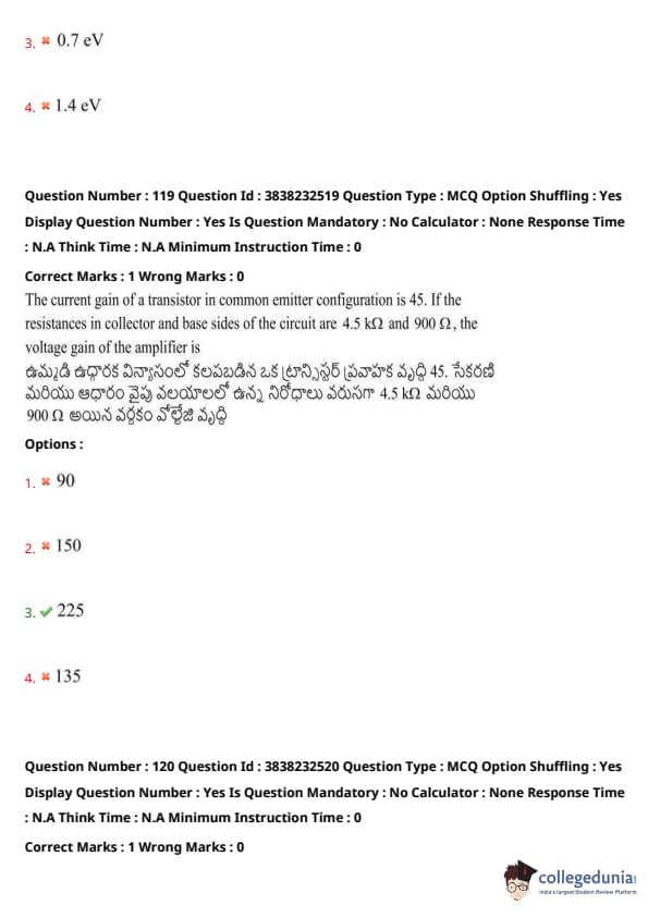 The current gain of a transistor in common emitter configuration is 45. If the resistances in collector and base sides of the circuit are 4.5 kΩ and 900 Ω, the voltage gain of the amplifier is: