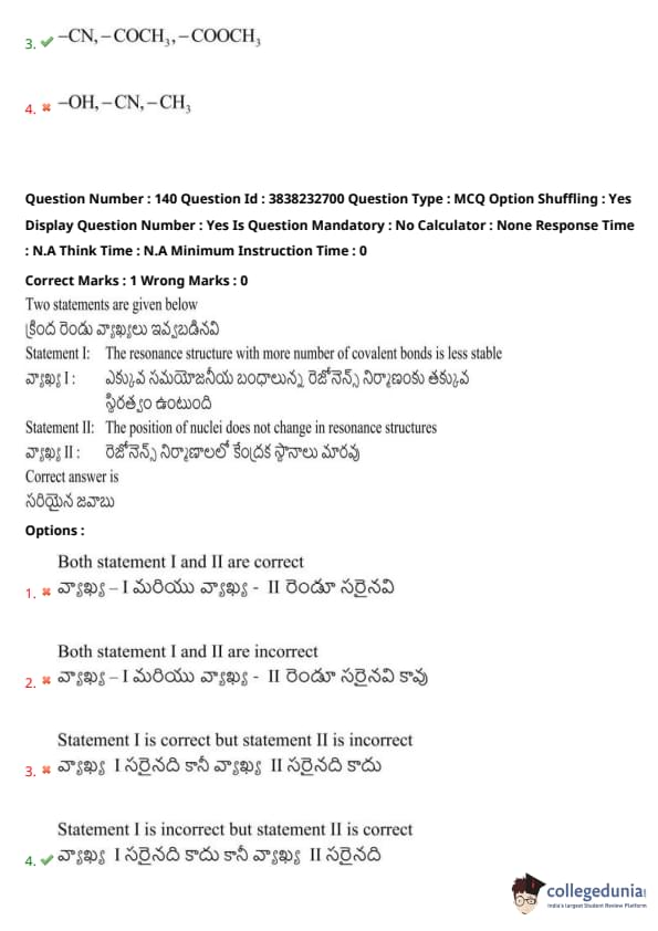 Statement I: The resonance structure with more number of covalent bonds is less stable.