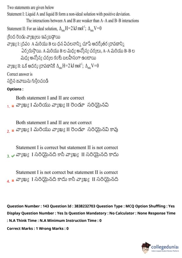 Statement II: For an ideal solution, \(\Delta_{mix} H = 2 kJ mol^{-1} \); \(\Delta_{mix} V = 0\).
