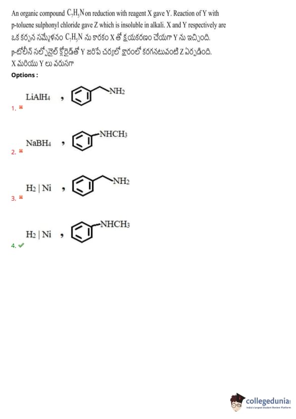 An organic compound \( C_7H_5N \) on reduction with reagent X gave Y. Reaction of Y with p-toluene sulphonyl chloride gave Z which is insoluble in alkali. X and Y respectively are: