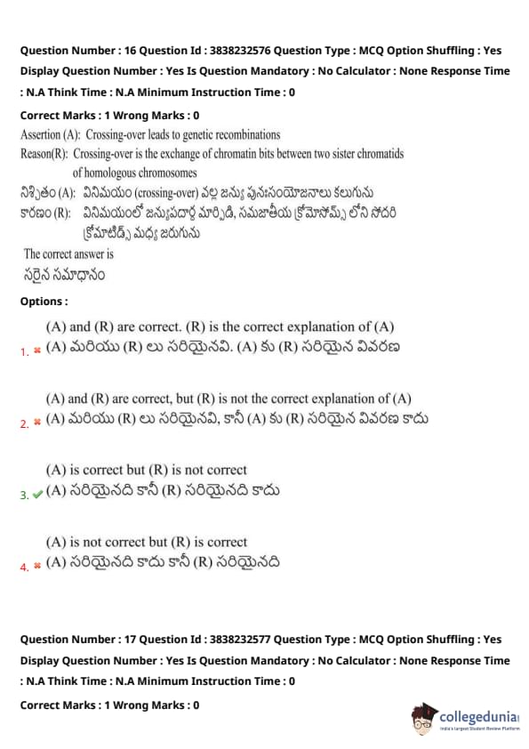 - The assertion (A) is correct because crossing-over during meiosis results in the exchange of genetic material between homologous chromosomes, leading to genetic recombination. This is a key mechanism that increases genetic diversity.