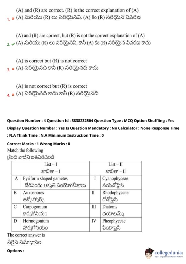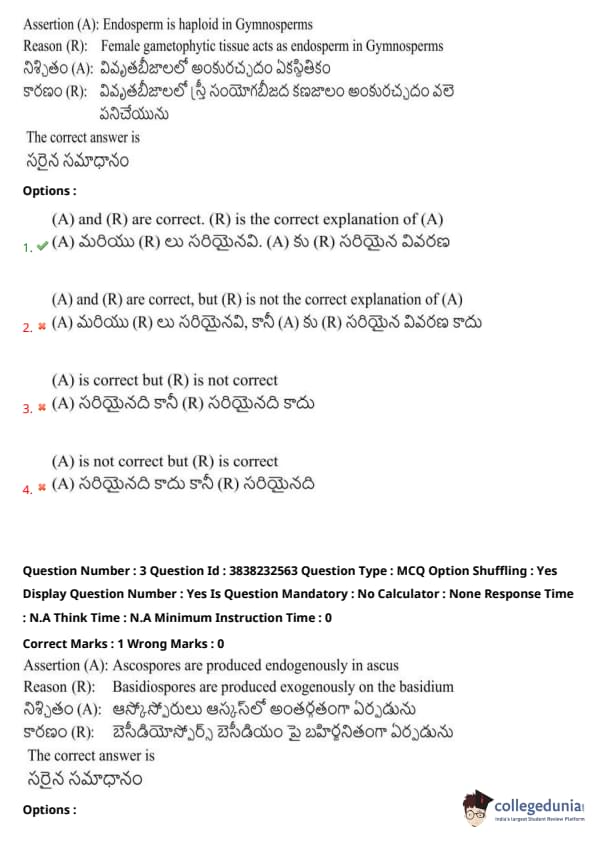 The assertion about Ascospores being produced endogenously is correct. Ascospores develop inside the ascus. However, the reason given about Basidiospores being produced exogenously on the basidium is also correct but is not related to the assertion, as Basidiospores are associated with basidiomycetes, not ascomycetes. Quick Tip: The assertion and reason are true, but they describe different processes: Ascospores in Ascomycetes and Basidiospores in Basidiomycetes.
