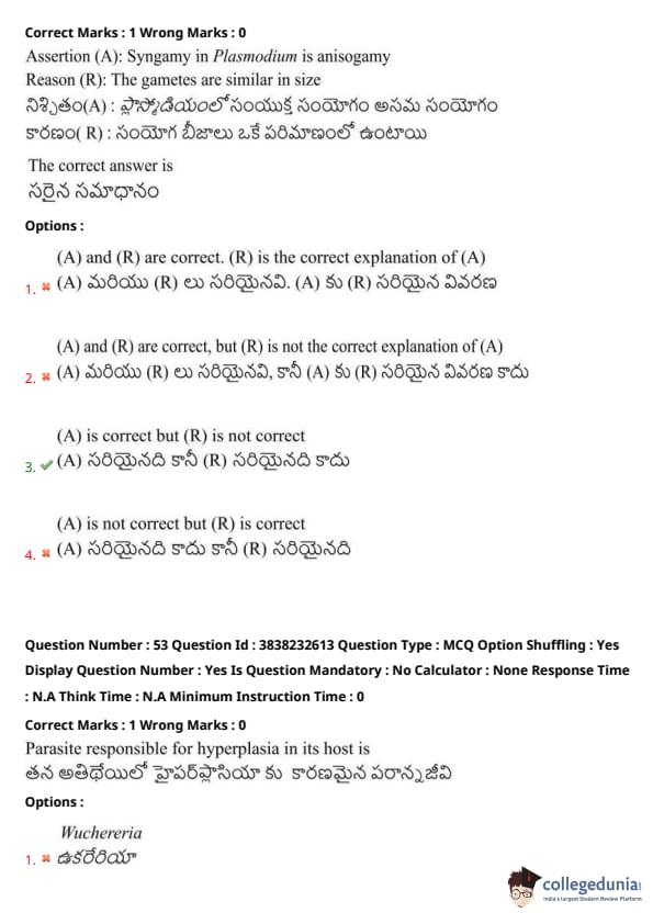 Assertion (A): Syngamy in \textit{Plasmodium is anisogamy