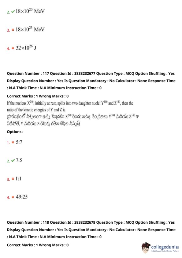 If the nucleus \(X^{240}\), initially at rest, splits into two daughter nuclei \(Y^{100}\) and \(Z^{140}\), then the ratio of the kinetic energies of \(Y\) and \(Z\) is