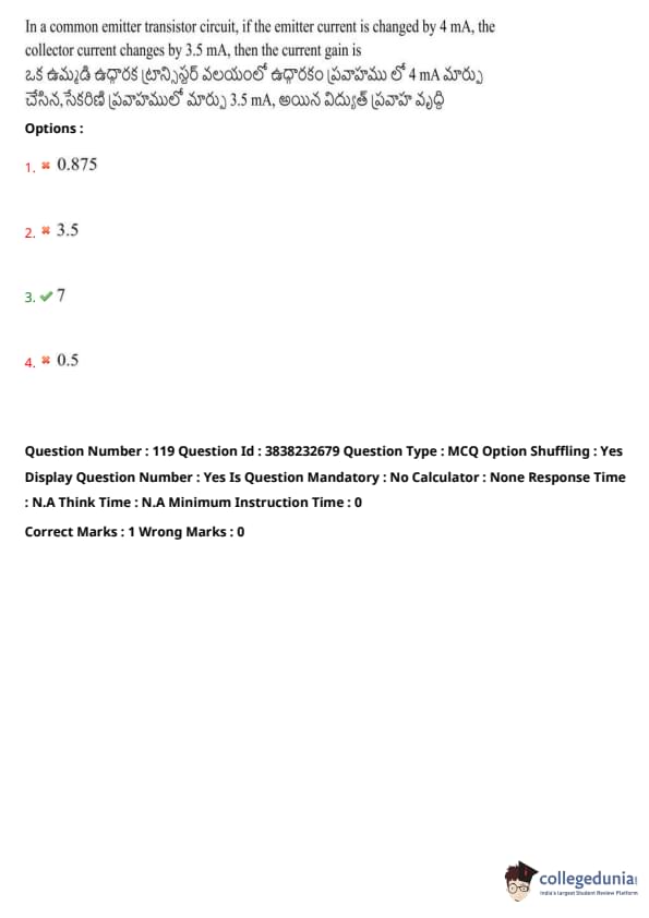 In a common emitter transistor circuit, if the emitter current is changed by 4 mA, the collector current changes by 3.5 mA, then the current gain is