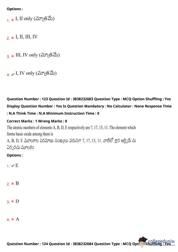 Thus, the correct answer is \( \mathbf{(1)} \) E. Quick Tip: Oxides of metals are generally basic, while oxides of nonmetals are acidic. Amphoteric oxides (e.g., \(Al_2O_3\)) show both acidic and basic behavior.