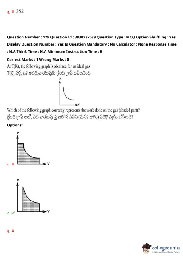 - Which of the following graphs correctly represents the work done on the gas (shaded part)?