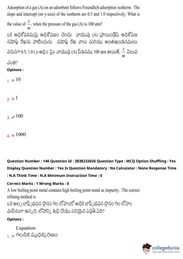 This corresponds to option (2). Quick Tip: For the Freundlich adsorption isotherm, the value of \( \frac{x}{m} \) can be calculated by using the slope and intercept from the graph of \( \log \left( \frac{x}{m} \right) \) vs. \( \log P \).