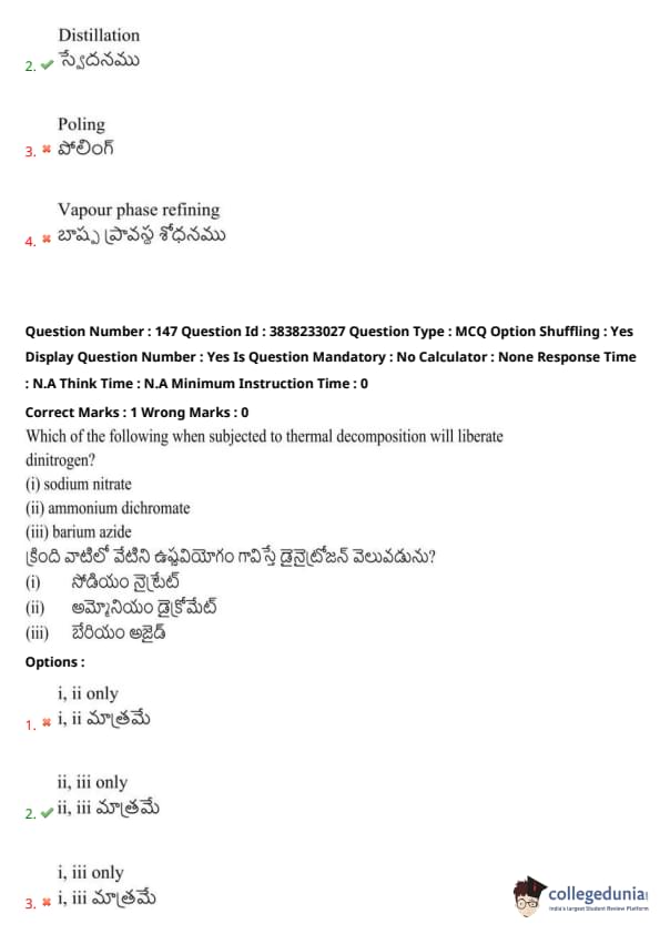 Sodium nitrate (NaNO\(_3\)) decomposes into NaNO\(_2\) and O\(_2\), not N\(_2\). Quick Tip: Compounds containing azide (\( N_3^- \)) or ammonium cation (\( NH_4^+ \)) tend to release nitrogen gas upon decomposition.