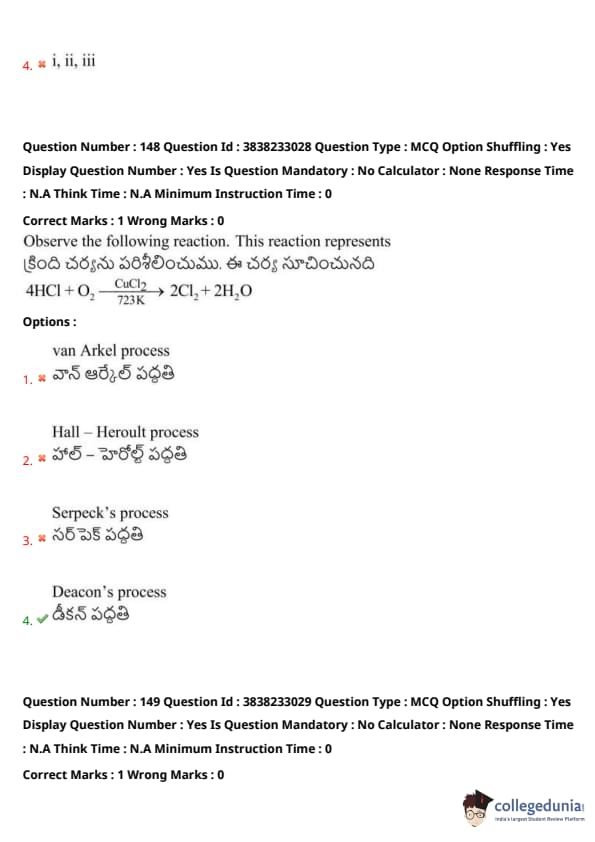 In this reaction, HCl is oxidized by oxygen in the presence of CuCl\(_2\) catalyst at 723K to produce Cl\(_2\) and H\(_2\)O. Quick Tip: Deacon’s process is an industrial method used for producing chlorine gas from HCl.