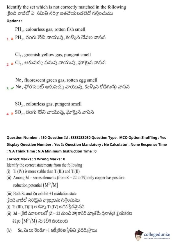 PH\(_3\) has a rotten fish smell, Cl\(_2\) is greenish yellow and pungent, and SO\(_2\) is colorless with a pungent smell, all of which are correctly matched. Quick Tip: Noble gases like neon are colorless and odorless, unlike other reactive gases.
