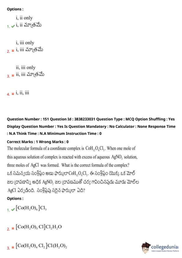 When one mole of the given complex reacts with excess AgNO\(_3\) solution, three moles of AgCl are formed. This suggests that the complex contains three chloride ions. The correct formula of the complex is [Co(H\(_2\)O)\(_6\)]Cl\(_3\), where Co is coordinated to six water molecules, with three chloride ions as counterions. Quick Tip: When determining the formula of a complex, consider the stoichiometry of the reaction with other compounds (like AgNO\(_3\)) to identify the number of ligands and counterions.