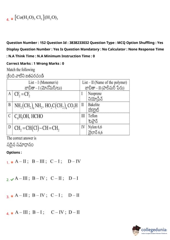 Final Answer: (2) A-III; B-IV; C-II; D-I Quick Tip: Polymerization reactions involve the combination of monomers, often creating polymers with distinct physical properties.
