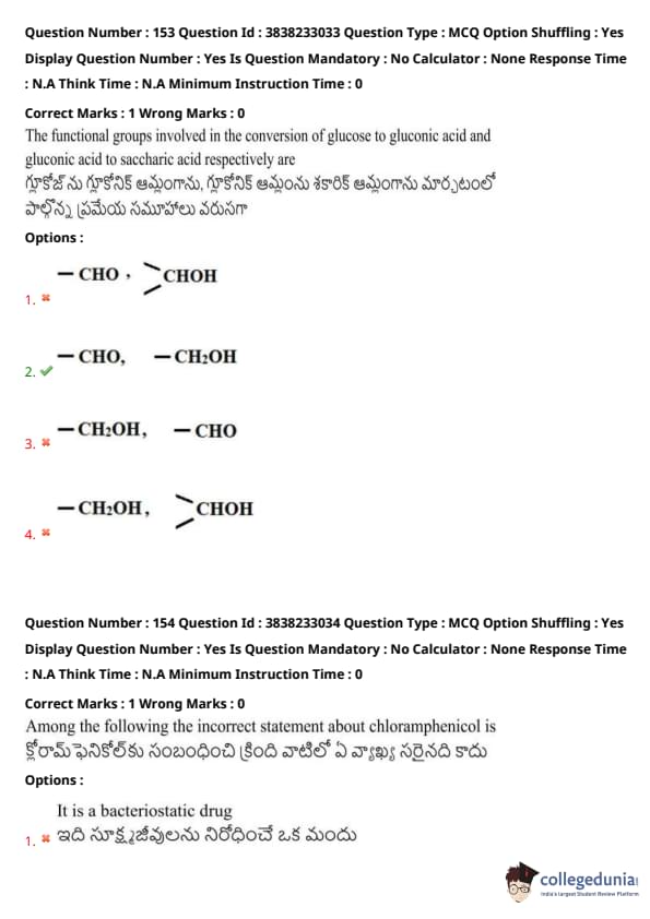 Therefore, the functional groups involved in the conversion of glucose to gluconic acid and gluconic acid to saccharic acid are -CHO and -CH\(_2\)OH, respectively. Quick Tip: Oxidation reactions often involve the conversion of aldehyde groups to carboxylic acids, which is seen in the conversion of glucose to gluconic acid and further to saccharic acid.