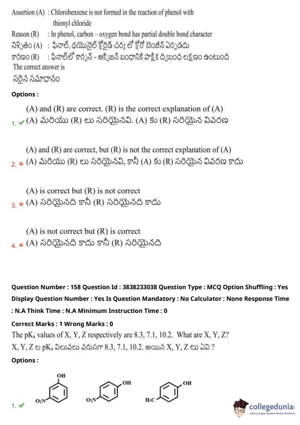 Since resonance explains the non-reactivity, (R) correctly explains (A). Quick Tip: Phenol’s C–O bond is strengthened by resonance, making it resistant to nucleophilic substitution.