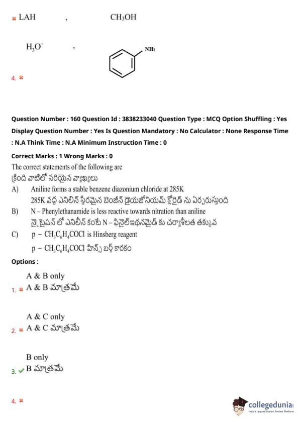 Final Answer: (3) B only Quick Tip: The Hinsberg test involves the reaction of amines with benzoyl chloride (p - CH\(_3\)C\(_6\)H\(_4\)COCl) to distinguish between primary, secondary, and tertiary amines based on the solubility of the products.
