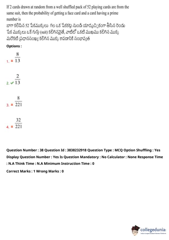 If 2 cards drawn at random from a well shuffled pack of 52 playing cards are from the same suit, then the probability of getting a face card and a card having a prime number is: