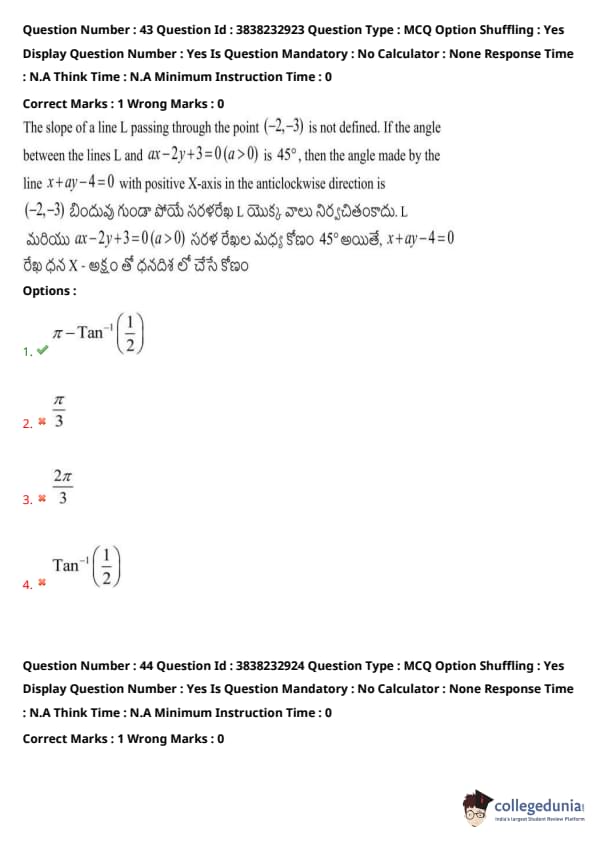 The slope of a line L passing through the point \((-2, -3)\) is not defined. If the angle between the lines L and \( ax - 2y + 3 = 0 \) (where \( a > 0 \)) is 45°, then the angle made by the line \( x + ay - 4 = 0 \) with positive X-axis in the anticlockwise direction is: