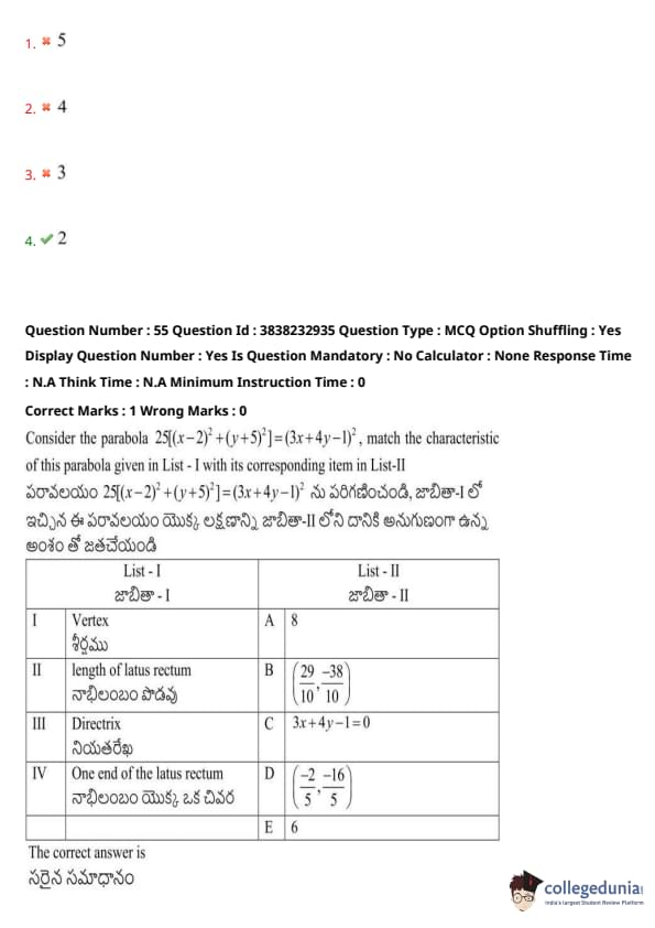 Consider the parabola \(25[(x-2)^2 + (y+5)^2] = (3x+4y-1)^2\), match the characteristic of this parabola given in List-I with its corresponding item in List-II.